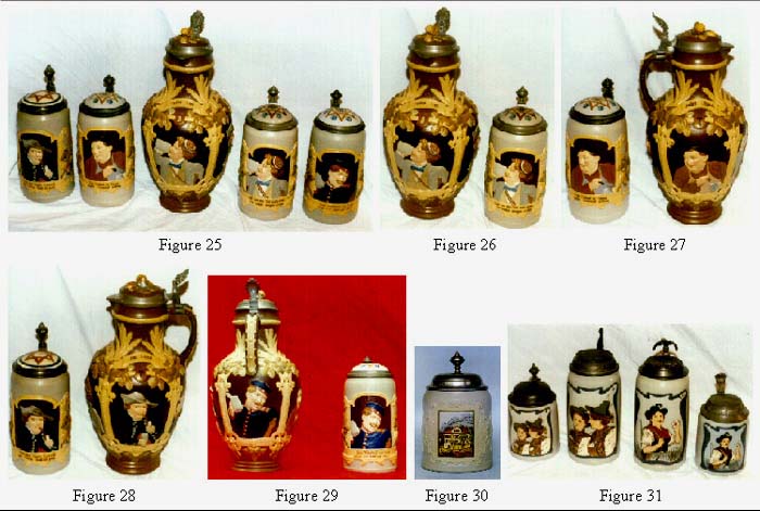 The central figure on this stein is a soldier holding a mug in his right hand. See figures 25 and 29. See form number 1756 for a description of the layout of this stein.