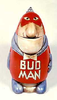 Due to its popularity, Bud Man was re-released as CS100 in 1989 and again as CS-213 in 1993. Both versions resemble a more modern, leaner Bud Man. CS213 is easily distinguished by sun glasses and a can of Bud in the right hand.Version 1 — CS1 Hollow head, fleur-de-lis thumblift, no knot in bow tie, normal colors, no trademark symbol.