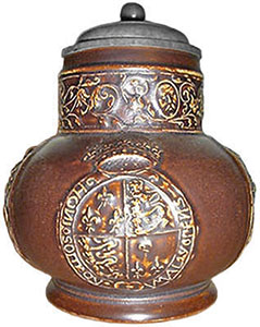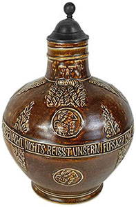 In addition to Jugendstil steins, Merkelbach had also produced a series of some forty-two Renaissance drinking and serving vessel replicas from museum originals that were depicted in the joint 1912 Steinzeugwerke catalog. These items were numbered 1 through 42, duplicating numbers applied to earlier Merkelbach offerings. They proved to be quite popular with collectors and were reproduced regularly throughout the remainder of the firms history. Some examples are depicted below.