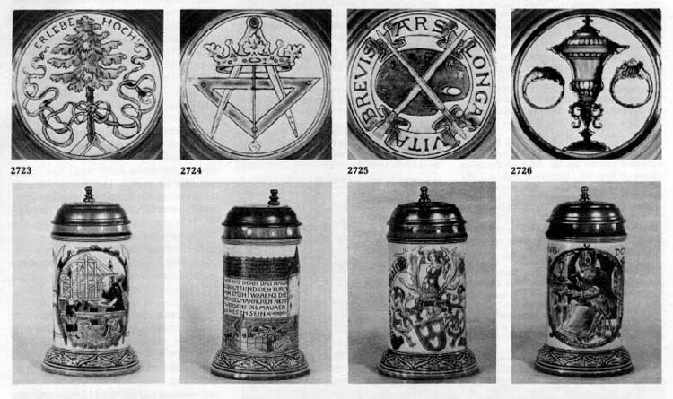 No. 2725 – Artist or painters – Palette and brush on inlay lid with the Latin inscription Brevis ors longs vita — “Life is short art is forever.” On the front of the stein is a maiden, antlers, and crown. On a ribbon is the saying: “This is the artists ancient coat of arms.”
