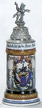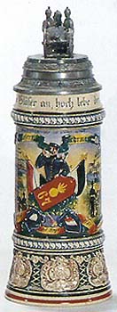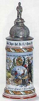 Regimentals have ornate pewter lids with as much variety in lid style, finial and thumblift as in the stein body decoration.