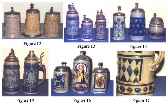 1820-1870: Plain gray, combed bodies, “Bavarian style” ½ and 1 liter steins (see figure 11), often with an over abundance of pewter. The foot rings sometimes extend 30% or more up the body.