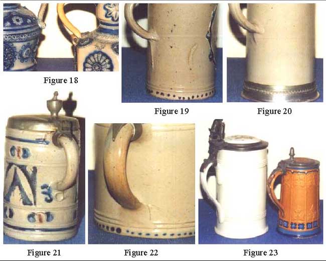 1600-1720: During this period we find a curled lower handle attachment. See figure 17. In the early to mid 1870’s the Westerwald firm of Reinhold Hanke and the Regensburg firm of Borho, Zinkl and Co. used a curled lower handle attachment on some of their “Historismus” pieces. See figure 18. There is no need to confuse the two and mistake the newer for the older. Look at the lower handle attachment in figure 17, and you’ll see a small “foot” that extends upward from the point of attachment adding strength. This small foot is not present on the newer “Historismus” pieces.