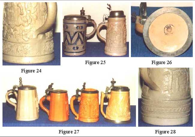 1865-1885: The handle attachment in figure 24 appears to be a combination of those used in figures 21 and 22. Seen separately by someone new to stein collecting, the handle in figure 24 could be confused with that in figure 21. Seen back to back the difference in handle shape and location is apparent. The one on the left in figure 25 is the earlier piece. Note the handle attachment locations. The steins manufactured in the Westerwald can be divided into two groups based on handle location. Those manufactured before the hiatus in stoneware stein manufacture, which occurred about 1830, and its resumption on a full time basis about 1865. During those 35 years, production was sporadic and the quantities produced were very low. On the older steins, the upper handle attachment is just below the rim and the lower attachment is at the mid-point of the body. The handle is located so high that there is no room for a shank and the hinge sits almost directly on the handle strap. When a shank is present on these early pieces, it is usually because there is a lid ring that causes the lid to sit at a higher elevation. Otherwise, we begin to see a shank appear on some Westerwald “Gepresste-Kännchen” steins as early as about 1845-50. On the newer steins the upper handle attachment is lower and the bottom handle attachment is two-thirds to three-fourths of the way down the body. There is a definite shank between the handle strap and the hinge.