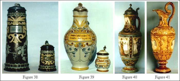 Several of the early P.U.G. decorations simulate tapestries nailed or screwed to the body, e.g., decoration numbers 595, 596, 597, 598 and 639. See figure number 37. These decorations were developed at about the same time as the early tapestry steins. The verses on the P.U.G. steins are either contained on the tapestries or in a box which appears to sit over a corner of the tapestry. These steins do not have gray bodies or raised tapestry panels.