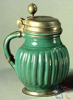 Bunzlauer Melonenkrug um 1732Türkisgrünes lehmglasiertes Steinzeug. Auf der bauchigen Wandung des Melonenkruges fünfundzwanzig reliefartig herausgearbeitete vertikale Rippen. Konkaver Hals mit einer Gurtfurche und zwei Rillen. Innen grünlich-gelb gefarbte Transparentglasur. Zinnmontierung mit Henkelband, die “1732” datiert ist. Höhe: 20 cm