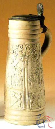 Siegburger Schnelle um 1600Weißes unglasiertes Steinzeug. Auf der konischen Wandung zwischen Wulstringen drei hochrechteckige Reliefauflagen. Im mittleren Feld Darstellung der Justitia, auf den Seiten der Kriegsgott Mars sowie die Göttin Venus mit Amor. Darunter drei verschiedene Wappen. Zinnmontiert. Höhe: 21 cm