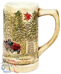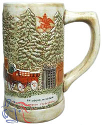 The tall version of this stein exists either with all cases in the wagon or with cases and barrels. The red A&Eagle logo can found at either the bottom or the top. There is also a quarter inch height difference between some examples and others, as well as multiple painting and glazing variations (see “Notes on Content” re: Variations). Note that some rare variations have sold at prices dramatically higher than the “normal” price range stated below. Lidded examples are also known to exist, but were not sold by Anheuser-Busch and are probably the product of after-market additions.