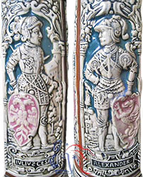 Central image depicts Charlemagne or Charles the Great (747-814), whose empire included much of western and central Europe. Side images are of Julius Caesar (100-44 B.C.) and Alexander the Great (356-323 B.C.).