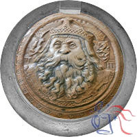 Central image depicts Charlemagne or Charles the Great (747-814), whose empire included much of western and central Europe. Side images are of Julius Caesar (100-44 B.C.) and Alexander the Great (356-323 B.C.).