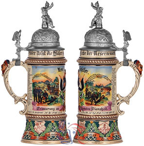 From the 1888 until the onset of World War I, German males between the ages of 17 and 20 were obligated to serve a period of active military duty, normally two or three years, after which they became reservists, subject to recall through the age of 45. Upon completion of active duty, reservists often purchased souvenirs in remembrance of their experience, personalized beer steins being the most popular of these service mementos.