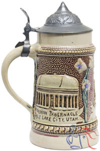This stein honors Brigham Young (1801�1877) a leader in the Latter Day Saint movement in the U.S., founder of Salt Lake City and the first governor of Utah Territory. Side images on the stein depict The Mormon Tabernacle and the Morman Temple in Salt Lake City.