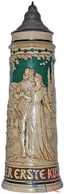 Scene taken from a poem entitled “The Trumpeter of Säckingen”, written in 1853 by Josef Viktor von Scheffel, which tells the story of a love affair between a trumpeter and a baron’s daughter. Original engraving entitled “Der erste Kuss” (The First Kiss) done in 1888 by Carl Schweninger (1854-1903).