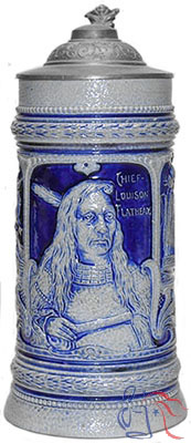 This series of steins honors 19th century American Indian tribal leaders. All bear the same model number and are otherwise identical except for the central images, which are drawn from photographs taken by Frank A. Rinehart (1861-1928) at the Indian Congress held in 1898 in conjunction with the Trans-Mississippi and International Exposition. Pictured examples include: Chief Louison, Flatheads (right); Chief Wolf Robe, Cheyenne (below left); and Chief Hollow Horn Bear, Sioux (below center).