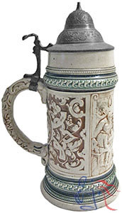 Pottery or stoneware, relief, 1.0L, pewter lid. Exists with music box in base (add 20%).