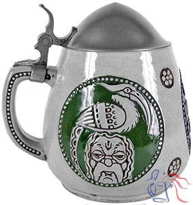 Stoneware, relief, 0.5L, pewter lid (shown with pressed metal lid). Design attributed to Wilhelm Ratelbeck.