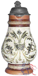 Porcelain, pottery or stoneware master stein; threaded relief; 1.0L; pewter lid. Same model number applied to a 0.4L drinking stein, text varies.
