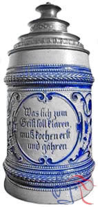 The 0.5L stoneware version of this stein has also been seen with an enameled transfer replacing the normal drinking verse (below right, add 75%).