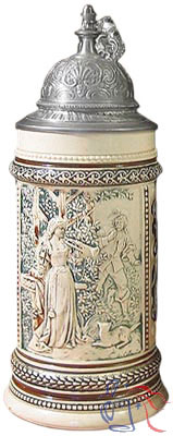 Pottery or stoneware, relief, 0.5L or 0.3L, pewter lid, signed “GT” (Gustav Thinwibel).