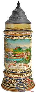 Pottery, transfer and relief, 0.5L, pewter lid.