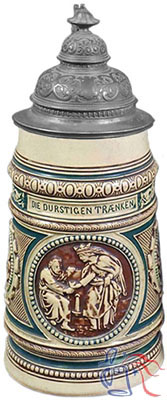 The central image on this stein depicts one of Christianity’s the seven corporal acts of mercy (i.e., Die Durstigen Traenken), given by Jesus in Chapter 25 of the Gospel of Mathew.