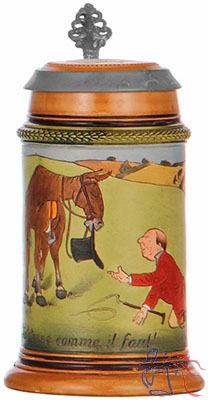 Fourth in a set of four steins featuring humorous equestrian scenes. However, note that unlike the other three, the image on this stein is titled in French rather than English.