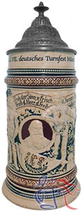 A version if this stein was produced with �Zur Erin. a. d. VII deutsches Turnfest M�nchen 1889� (In memory of the German Gymnastics Festival Munich 1889) appearing around the top band. (Add 20%)