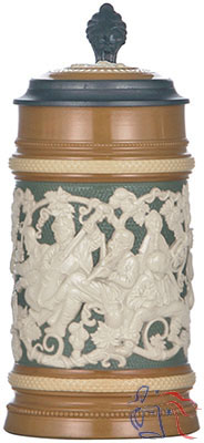 Early 0.5L parian versions of this stein (below, bottom row) were produced in both painted and unpainted versions and with either a gnome or nesting doves figural inlay.