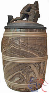 The body of this stein can be found with either two or three applied barrel hoops, as well as two different handles and varying coloration. The “standard” inlay has relief hops leaves and a figural hops bud, and exists in both monochrome and full-color versions. Other options include a similar leaf pattern inlay with the hops bud deleted, and figural inlays depicting a dwarf with his head in a large stein, a fox, a child, and others.