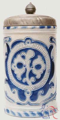 This is a reproduction of a mid-18th century Westerwald stein and features a floral centerpiece design. The blue dots surrounding both the top and bottom bands can be found on many Westerwald steins of this era. The pewter lid is made in the old conservative baroque style.