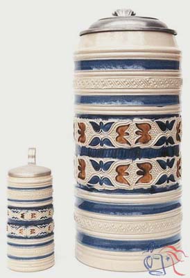 This stein is distinguished by its tall form. The central frieze features a geometric pattern of bird-like shapes. The original Westerwald stein dates back to around 1720. The embossed pewter lid displays the portrait of an unknown aristocratic general.