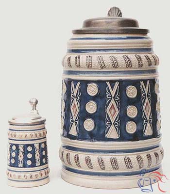 This stein reproduces a circa 1700 Westerwald original. The central frieze is made up of repeating geometric patterns with ferris oxide (brown) highlights. The raised upper and lower borders are both “stippled” and striped, also in geometric patterns.