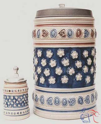 This is a reproduction of a Westerwald stein from the early 18th century. The center band consists of four rows of relief rosettes on a background of cobalt blue. The upper and lower bands are a combination of oval- and heart-shaped relief in alternating blue and brown colors.