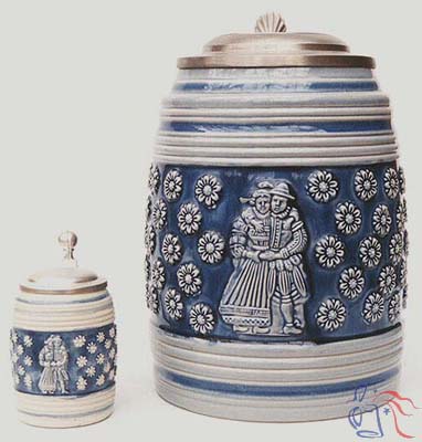 The original of this stein was made in the Westerwald around 1730. The relief portrait in the front of this unusually-shaped piece shows a couple wearing festive clothes and surrounded by blossoms that cover much of the stein’s body. Above and below the central frieze are relief blue bands.