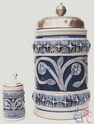 This stein was reproduced from a Westerwald original from the first half of the 18th century. The central frieze contains a continuous pattern of vines and flowers. The upper and lower borders feature a raised geometric pattern composed of diamond and semi-circular shapes.