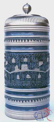 This is a reproduction of an original Westerwald stein circa 1750. It features three applied relief panels depicting the city of Bethlehem. Above and below the panels are multiple relief bands.